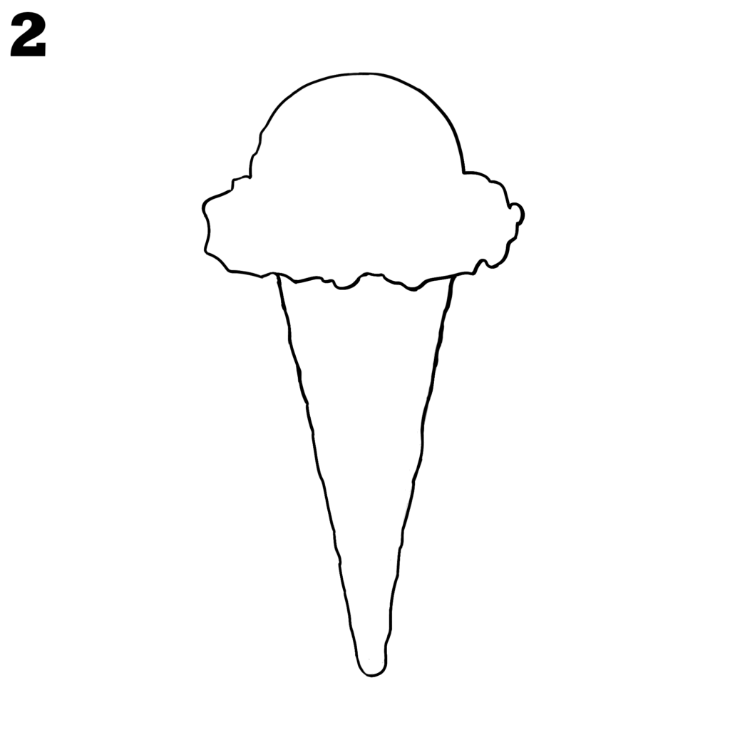 Start by making the basic shape of the ice cream. Draw a rounded top for the scoop, then add a slightly wider curve at the bottom sides of the scoop. Below this, create a long triangle pointing downward for the cone. Keep the lines light so you can adjust them later.