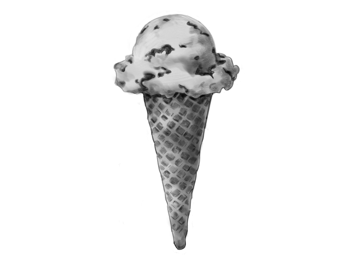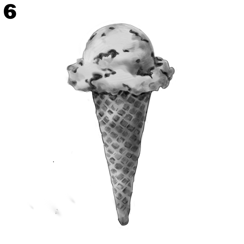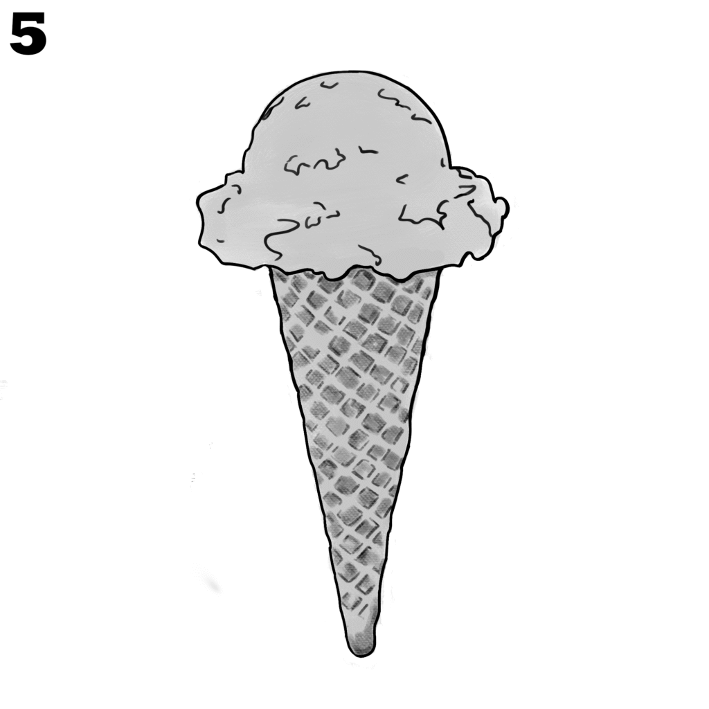 Darken some areas of the ice cream scoop to make it look more three-dimensional. Add a few darker spots to show chocolate chips or fruit bits if you like. Also, slightly darken the cone’s edges and pattern lines to finish the drawing.