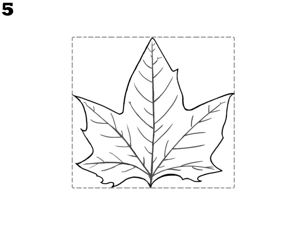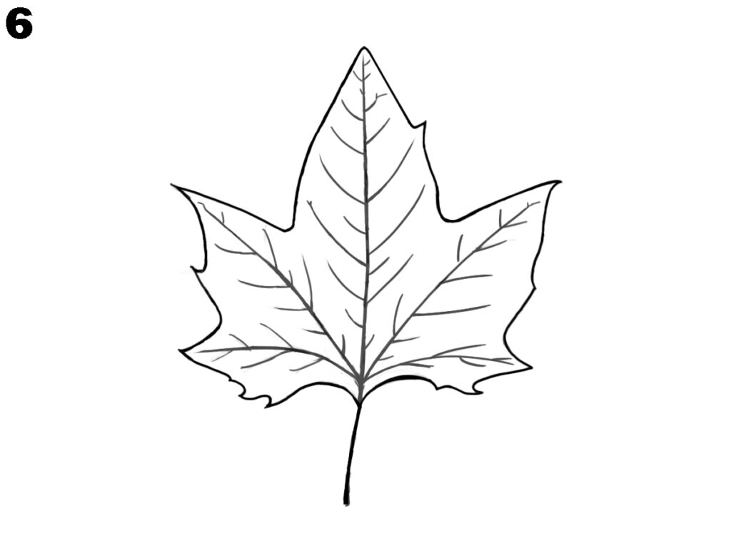 To complete your maple leaf drawing, add soft shading around the inside parts of the leaf. You can shade lightly near the edges and around the veins. This gives your drawing a finished look. Now your maple leaf is complete, drawn in a simple and clear way that’s easy for anyone to follow.