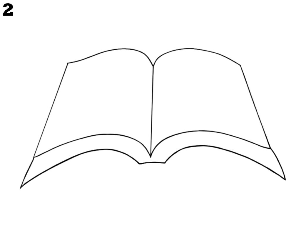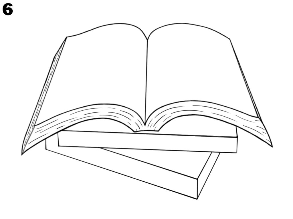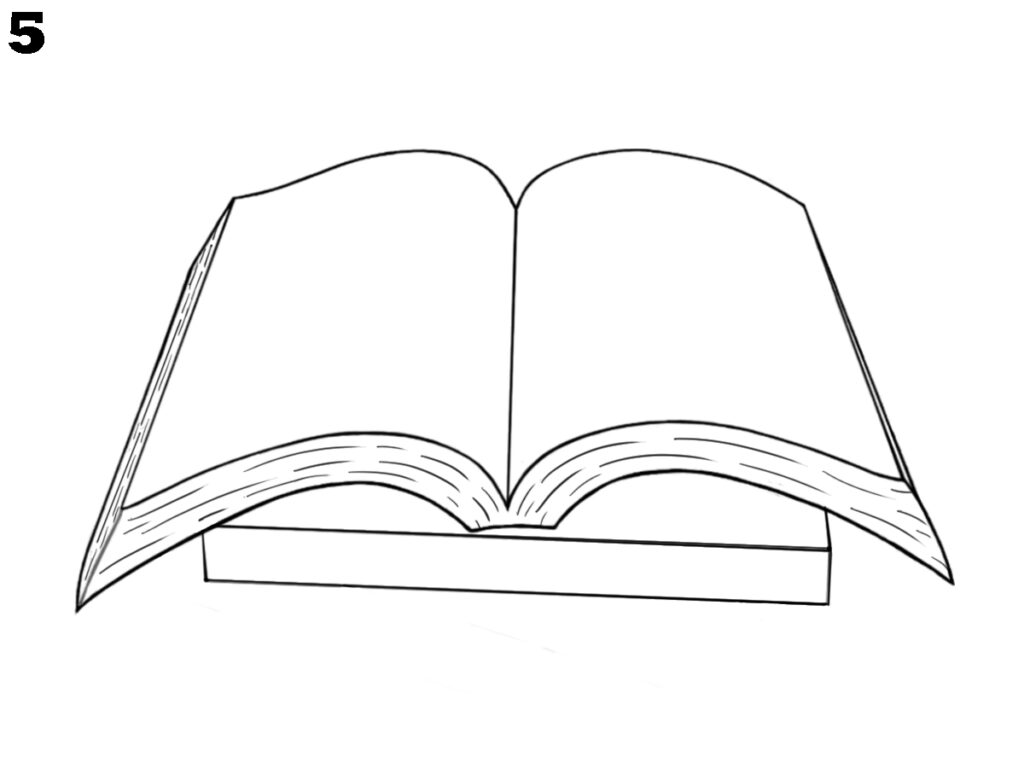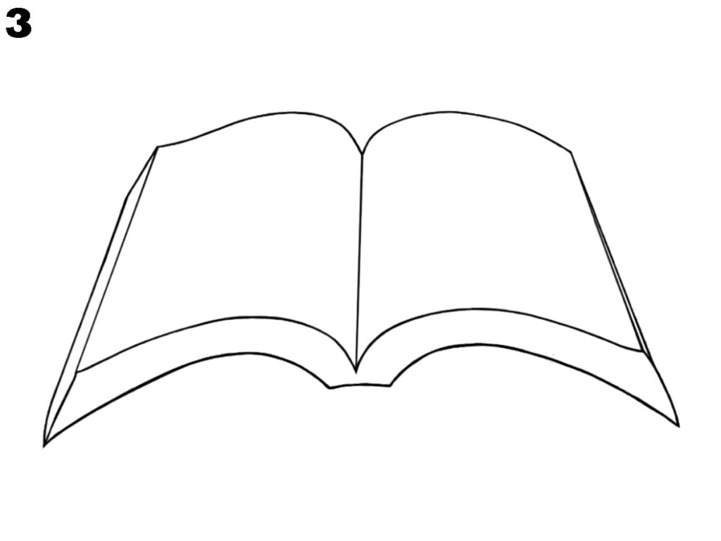 Inside the book, draw several thin curved lines near the middle fold to show where the pages meet. This will help the book look more real. Make the curves follow the shape of the open pages without pressing too hard.