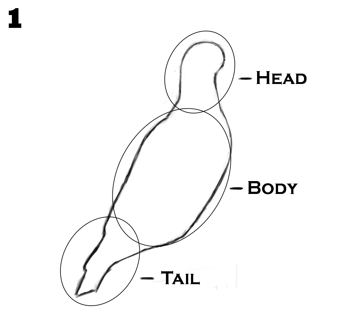 Start by sketching three simple oval shapes to make the head, body, and tail. Join them together with smooth lines so they look connected. The head is small and round, the body is larger and oval, and the tail is thinner at the end. This is just a guide, so keep your lines light.
