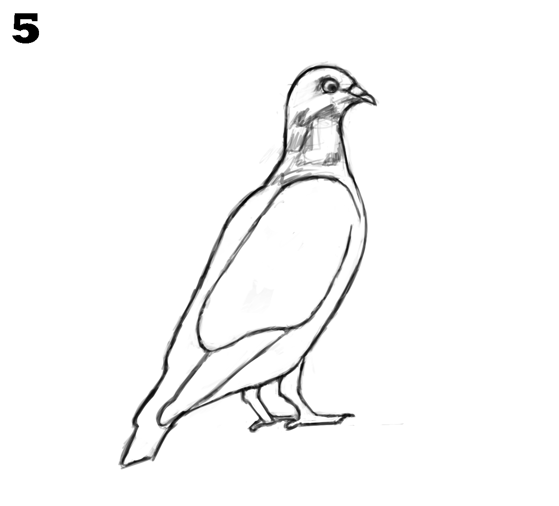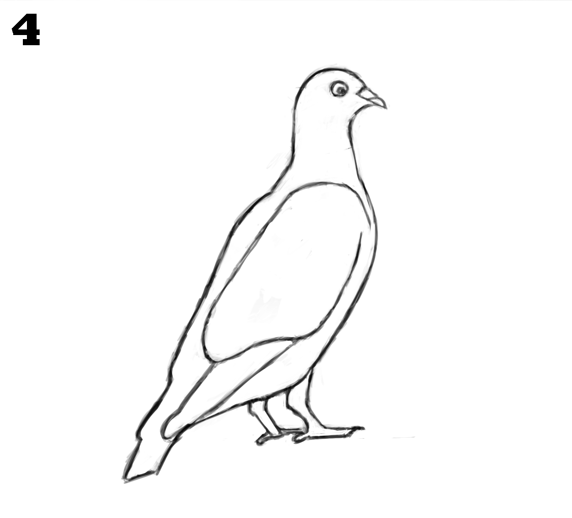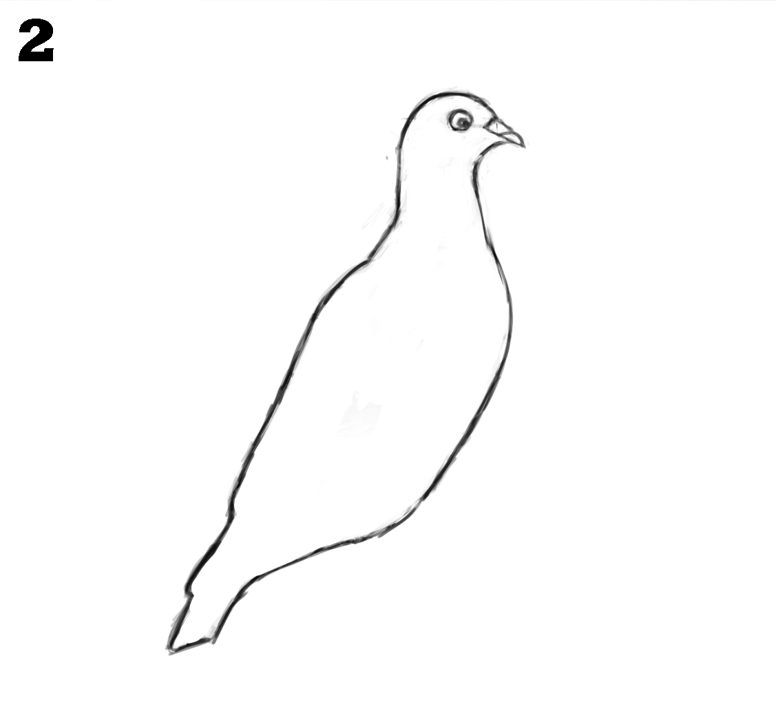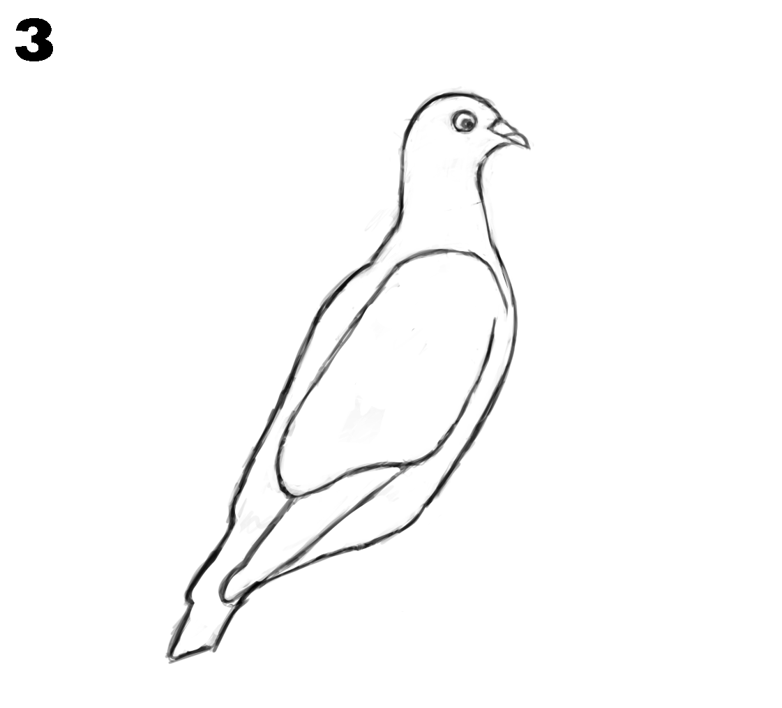 Using the shapes from Step 1 as a base, draw the outline of the pigeon’s body. Add the curve of the head, neck, and back, along with the beak. Shape the tail smoothly. Erase any extra guide lines you no longer need so the outline looks clear.