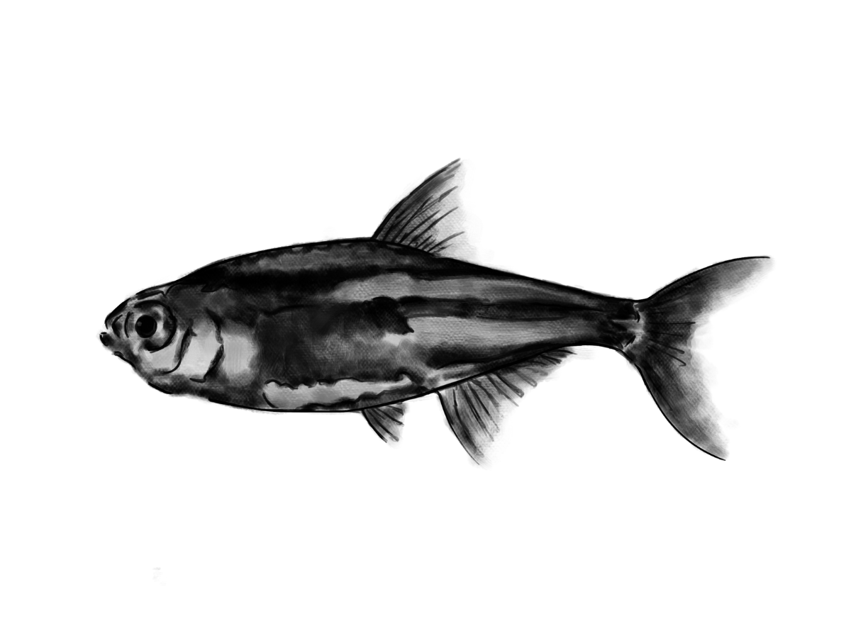 Fill the body lightly with even shading to make it look solid. Keep the top fin and tail slightly darker than the body. Add a little shadow under the fins to give the fish a more three-dimensional appearance.