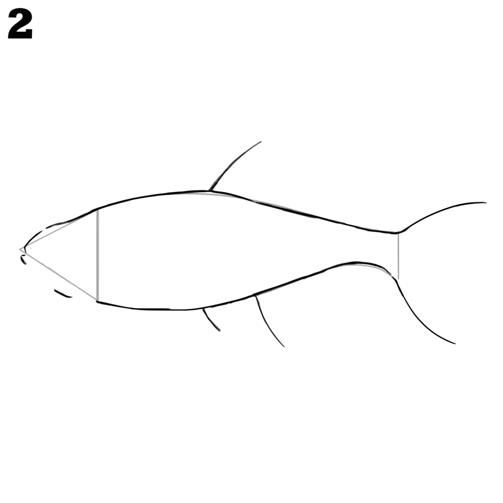 Round off the pointed head by softening the triangle into a smooth curve. Shape the tail lines more clearly, giving them a slight bend for a natural look. Add slight curves to the fin outlines so they blend with the body shape.
