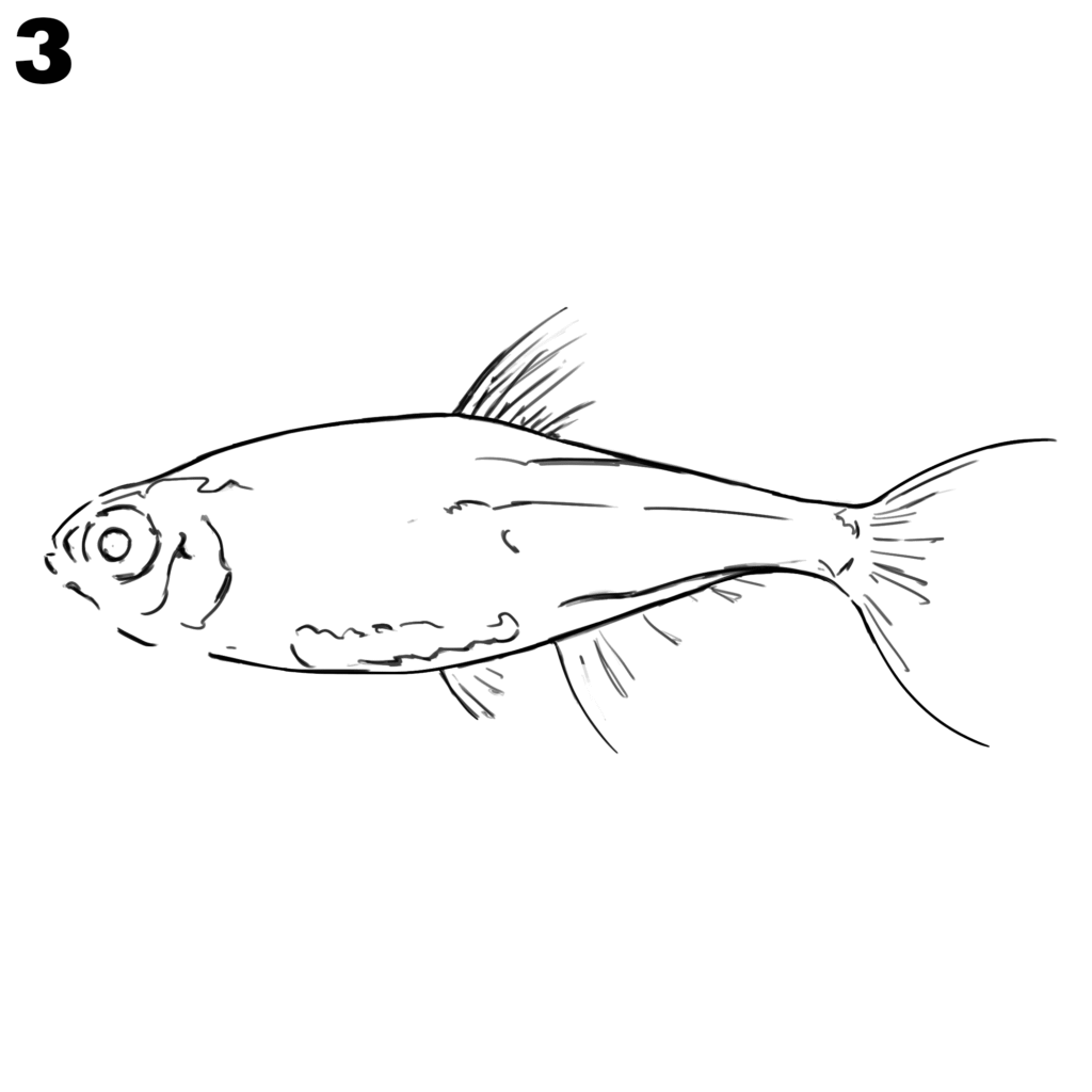 Draw the eye near the head with a small circle. Add lines for the top fin, bottom fin, and side fins. Sketch small details inside the fins and begin marking a line along the body for later shading.
