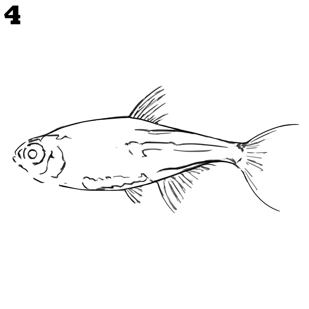 Make the fins more visible by refining their edges with thin lines. Add small strokes to show the direction of the fin rays. Shape the tail with a smooth split in the middle so it looks like a real fish tail.
