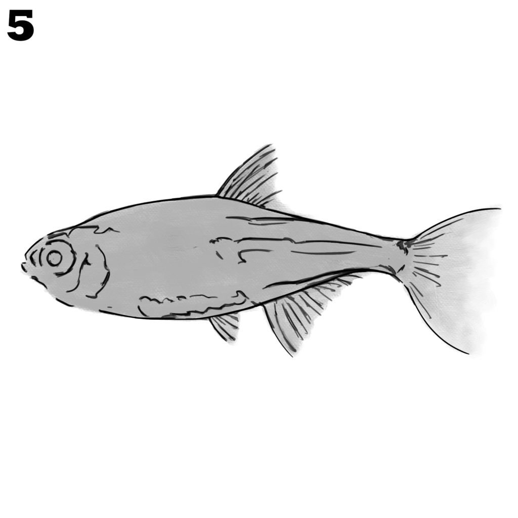 Deepen the shading along the top of the fish and near the tail. Add more contrast in the fins and darken the eye slightly. Blend the shading smoothly so the fish looks realistic and complete.