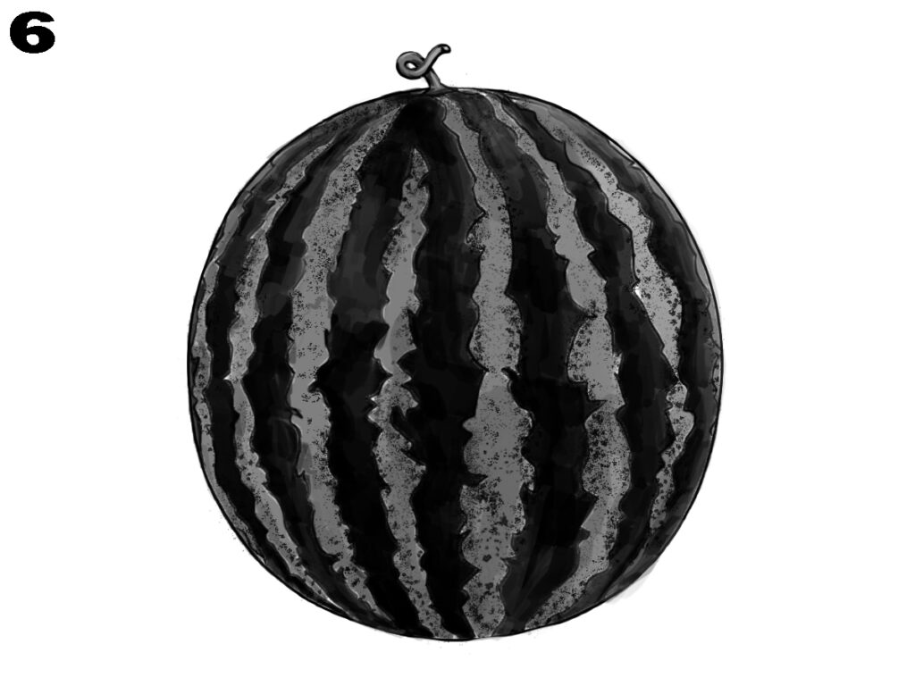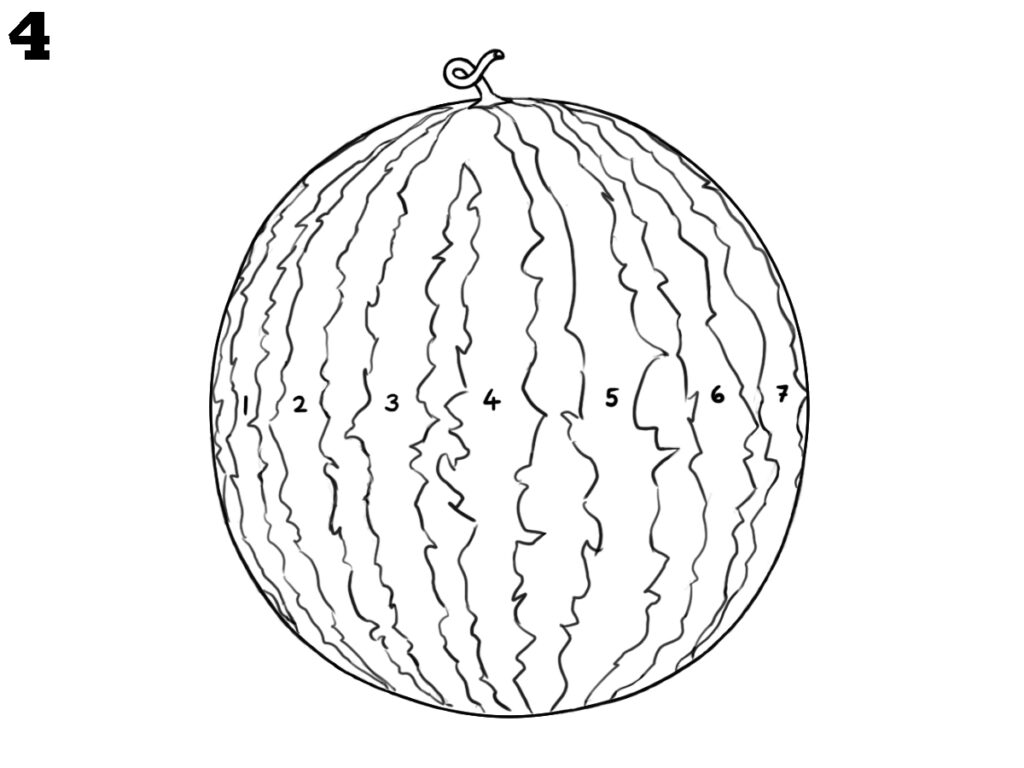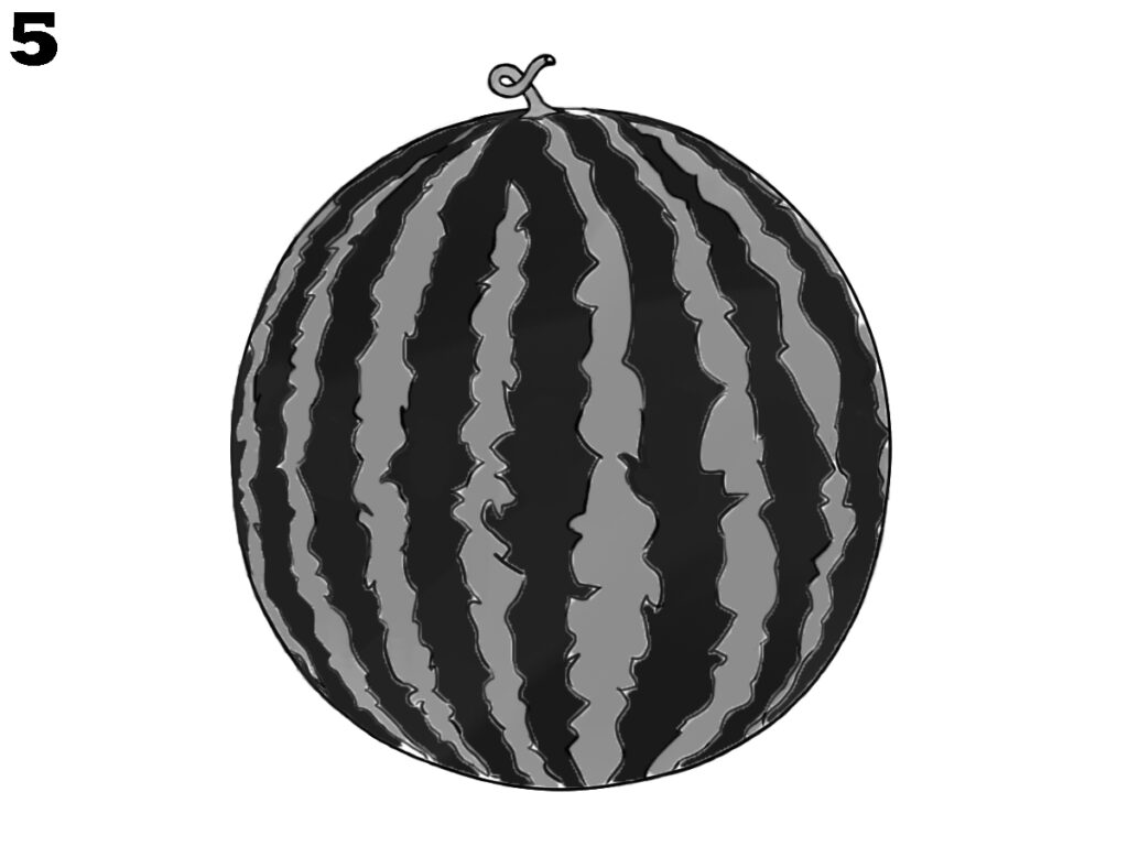 In the last step, gently add shading to the lighter stripes. Use a softer color than the dark ones to show light and shadow. You can also shade a little near the bottom and sides to show roundness. Once you’re done, check all parts and fix any lines if needed to complete your watermelon drawing.
