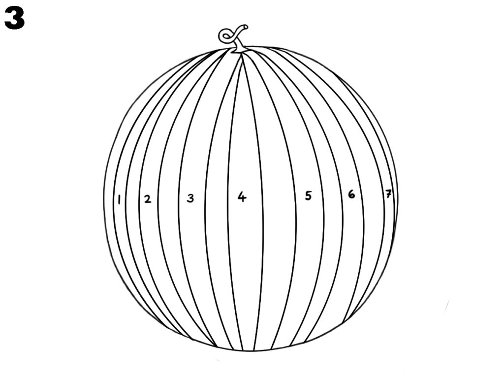 Next, draw long curved lines starting from the top of the watermelon down to the bottom. These lines should follow the shape of the circle and spread evenly around it. This will help show the natural pattern that watermelons have. Make sure not to draw them too close together or too far apart.