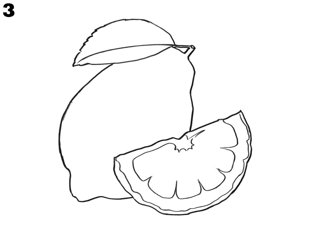 Darken the outer lines to make the drawing clear. Add veins inside the leaf. Shade the leaf and slice more, and smooth the skin of the lemon with soft strokes. Make sure all parts of your easy draw lemon are balanced. Your lemon now looks full and natural.