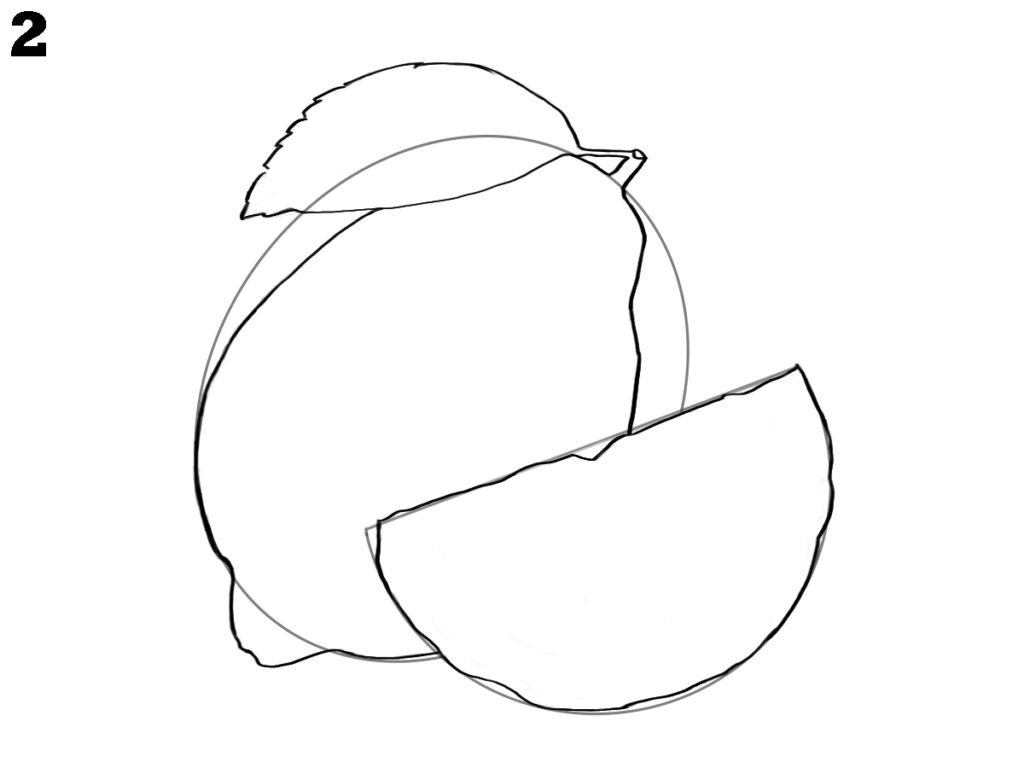 Start by drawing one big oval shape for the lemon’s body. Then, draw a smaller circle overlapping the lower part of the big one. This smaller shape is the sliced part. Keep your lines smooth. This base shape makes it easy to follow in your lemon easy drawing. It helps set up a clean outline for the rest of the steps.